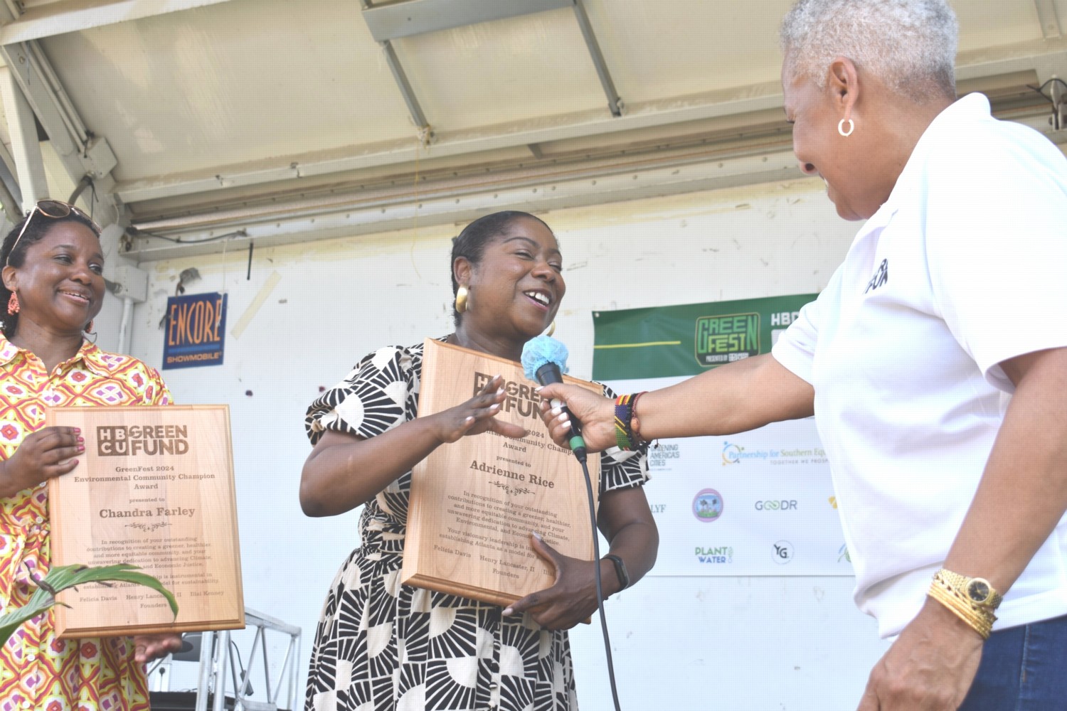 Felicia Davis (far right) presents Environmental Champion Award to Adrienne Rice of Sustainable Georgia as awardee, Chandra Farley of the City of Atlanta (far left), looks on during HBCU Green Fund’s GreenFest last year.