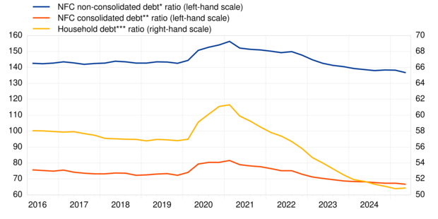 NFCs' debt-to-GDP ratio (consolidated measure) decreased to 66.3% in the second quarter of 2025, from 67.9% in the second quarter of 2024; the non-consolidated, wider debt measure decreased to 136.7% from 138.7% (see Chart 2).