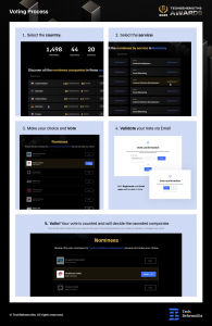 Voting is simple and secure: select the company’s country and service category, click “Vote,” and confirm via email. Each person may vote once per company, with all votes verified to prevent duplicates or fraud.